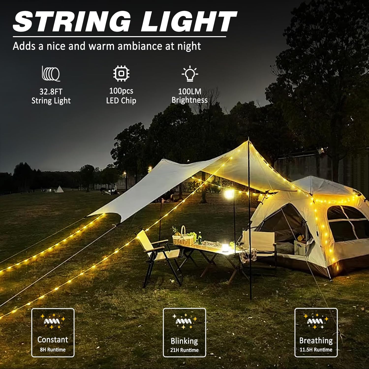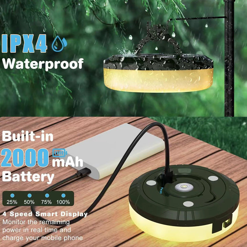 Med et 2000mAh batteri tilbyder vores campinglamper udvidet belysning til alle dine eventyr. Med IPX4-certificering er de vandtætte og pålidelige under forskellige vejrforhold. Nyd stærkt, pålideligt lys, uanset hvor du går.